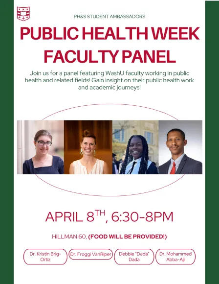 Join us for a panel featuring WashU faculty working in public health and related fields! Gain insight on their public health work and academic journeys!